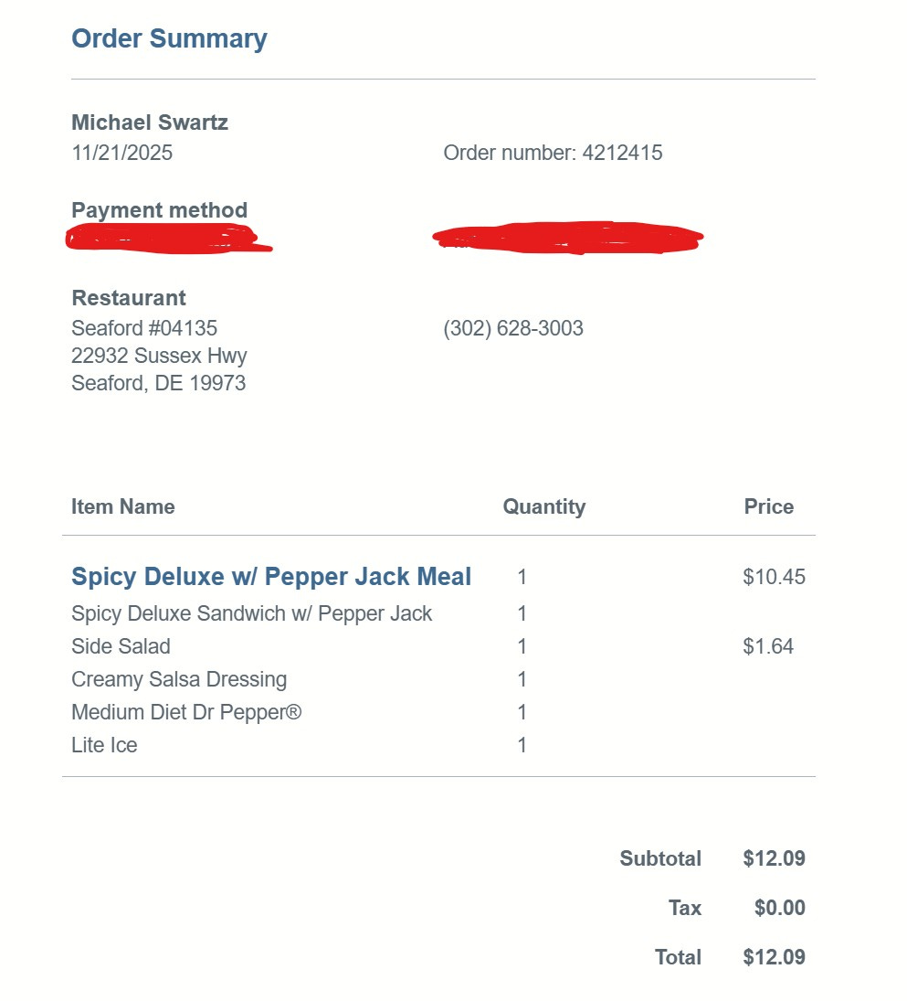 Since I’m also writing ahead a couple weeks to give myself a little uninterrupted book-writing time, the other receipt I’ll show you is from November 21. I took Black Friday off so no CFA that day, and last Friday I had some good leftover pizza calling my name instead. (This is from my CFA app - no paper receipts anymore.)