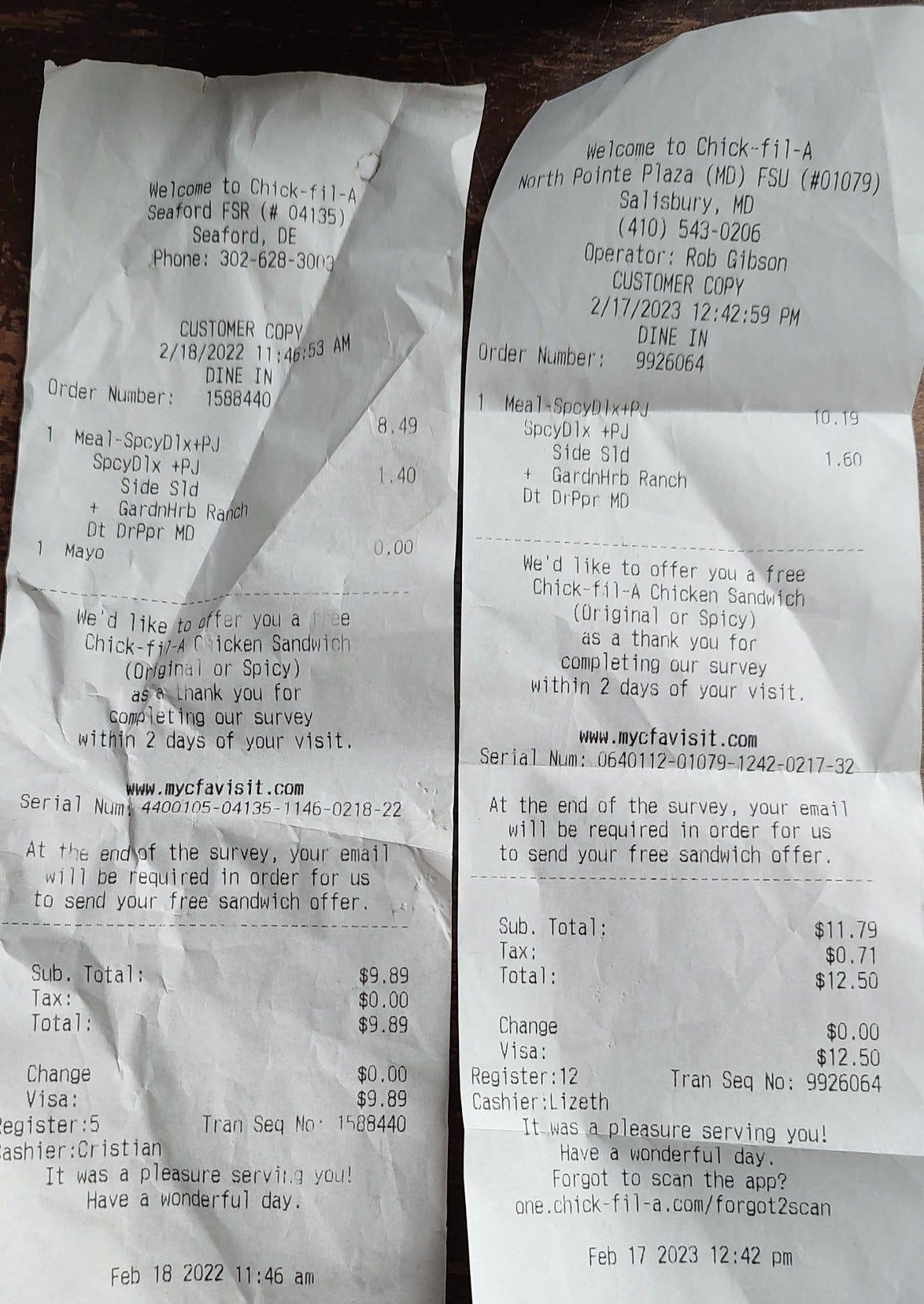 During my extended Thanksgiving weekend, though, one of the nagging chores I finally got around to was to get out the bin with my winter clothes in it and put away the summer stuff, so I extended that task to a general and, as it turns out, long overdue cleanout of my dresser. I say long overdue because I found a slew of old receipts from back in the day of 2022-23 that had somehow fallen in there. Funny thing: two of them were CFA receipts dated exactly 52 weeks apart.